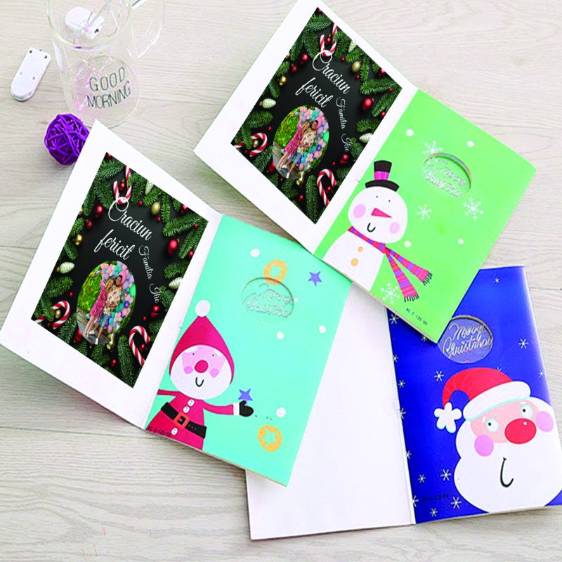Pe partea frontală a globului, poți găsi un spațiu dedicat pentru prima fotografie. Această fotografie poate fi o imagine reprezentativă a familiei tale, poate surprinde un moment special de Crăciun sau poate fi o fotografie care îți aduce zâmbetul pe buze în fiecare an.